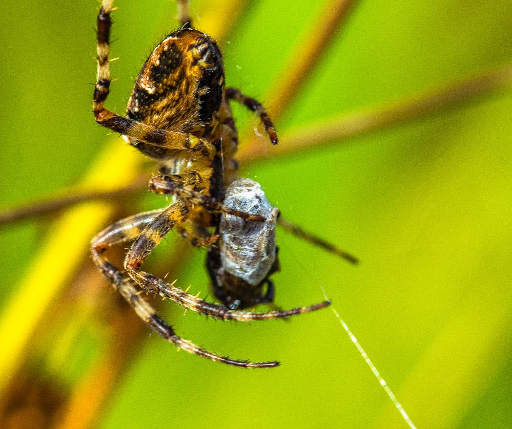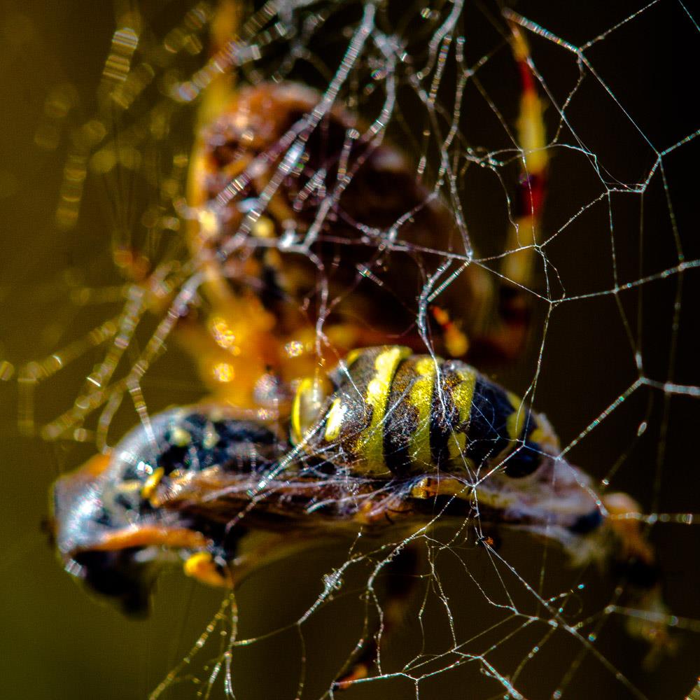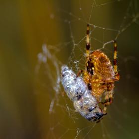 Zurück zu den Erbauern dieser Meisterwerke der Natur, den Spinnen. Spannend ist der Beutefang und das "Eintüten" der Beute in einer Seidenhülle, um das Insekt auszusaugen.