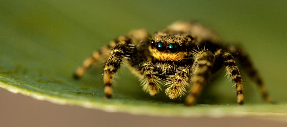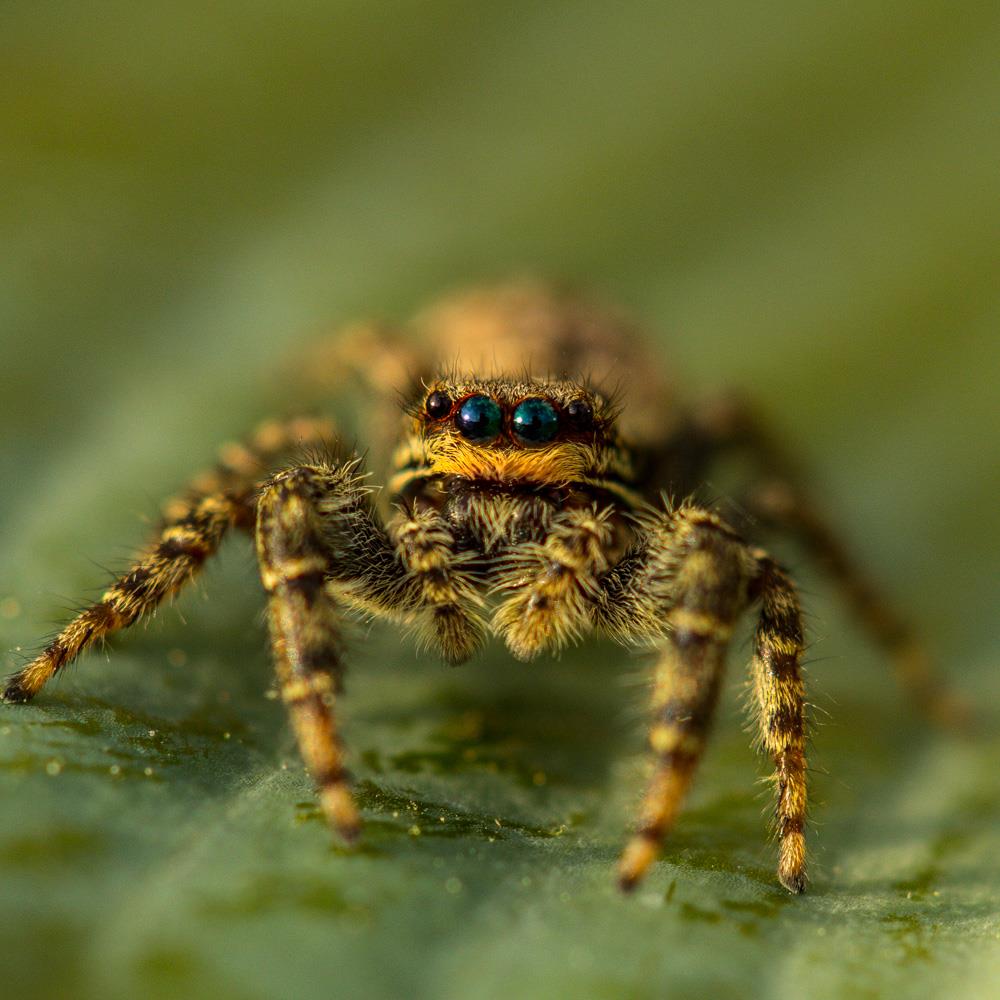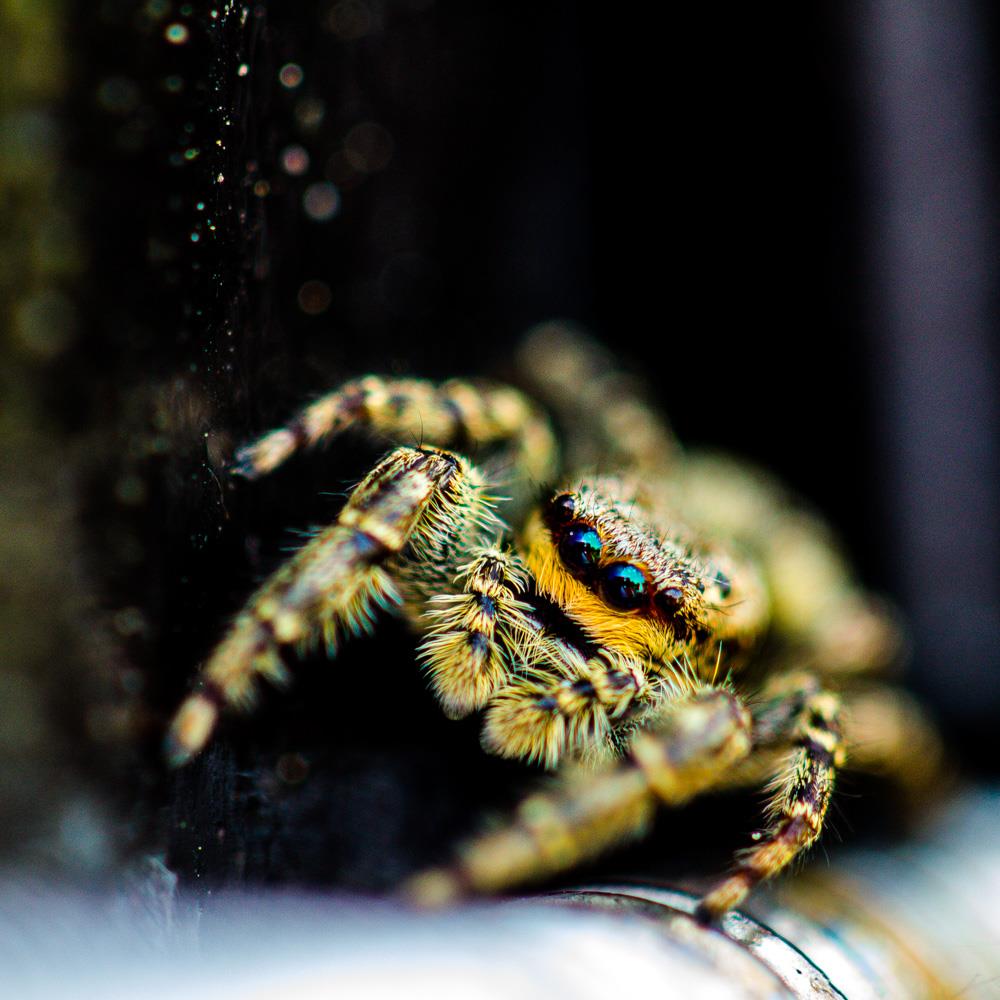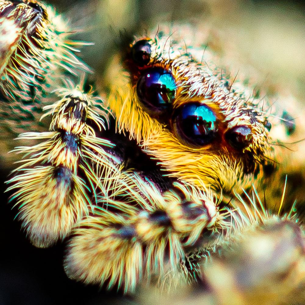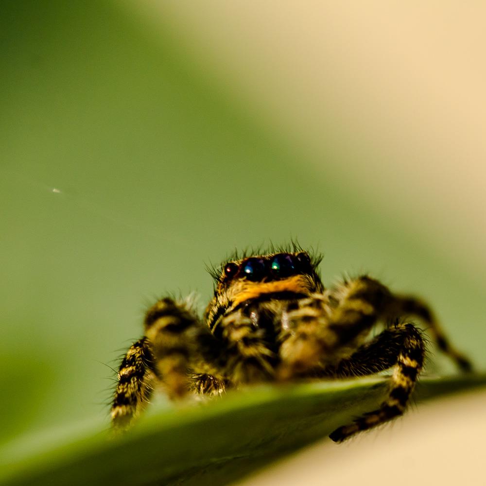 Als Fotomotive besonders geeignet sind Springspinnen. Wenn man sie einen Moment in Ruhe lässt und sie verweilen, schauen sie mit ihren großen Augen direkt ins Kameraobjektiv; und das sind die Momente, in denen man den Auslöser drücken sollte. Ich meine auch, dass die Sprinnspinnen einen Beobachten und jede Aktivität des Beobachters selbst registrieren. Herrliche Spinnen ...